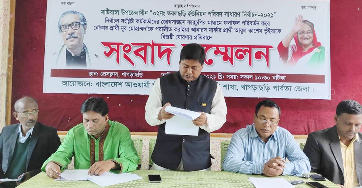 খাগড়াছড়ির মাটিরাঙ্গা উপজেলায় ইউনিয়ন পরিষদ (ইউপি) নির্বাচনে প্রশাসনের সহযোগিতায় কারচুপির মাধ্যমে তিন দফা ফলাফল পরিবর্তন করে নৌকা প্রতীকের প্রার্থী নুর মোহাম্মদকে পরাজিত করার অভিযোগ উঠেছে। এ ঘটনায় তবলছড়ি ইউনিয়ন পরিষদ নির্বাচনের ফলাফল স্থগিত এবং পুনরায় ভোট গণনার দাবি জানিয়েছে উপজেলা আওয়ামী লীগ।
