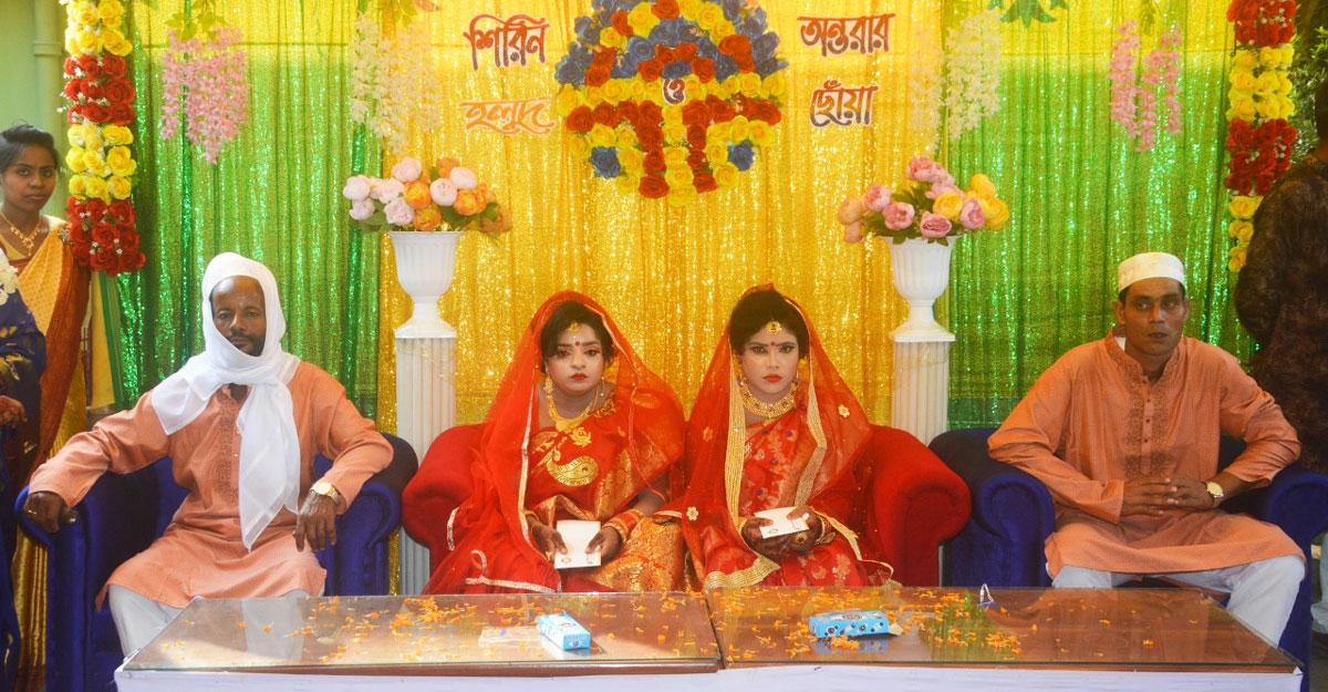 এক পিঁড়িতে দুই কন্যার বিয়ে। বধূ সেজে অপেক্ষা করছিলেন কনে অন্তরা বেগম ফজিলা (৩৩) ও শিরিনা খাতুন (৩৩)। বরযাত্রী নিয়ে এলেন দুই বর। সদর দরজায় আগে থেকেই ফুল নিয়ে অপেক্ষা করছিল কনেপক্ষ। বর আসতেই ঝরে পড়ল ফুলের পাপড়ি। এরপর শরবত পান করিয়ে বর-বরণ। একে একে চলল বিয়ের নানা আনুষ্ঠানিকতা।