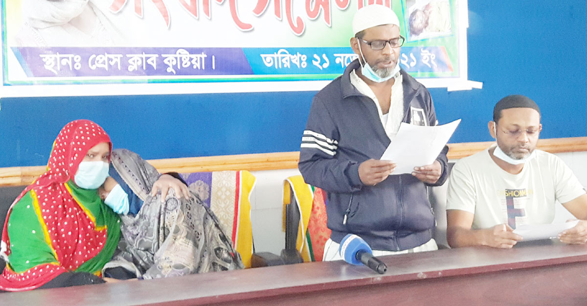 কুষ্টিয়ার মিরপুরে এক স্কুলছাত্রীকে (১৪) অপহরণ করে দলবেঁধে ধর্ষণ শেষে হত্যার ঘটনায় জড়িতদের গ্রেফতার ও দৃষ্টান্তমূলক শাস্তির দাবিতে সংবাদ সম্মেলন করেছে তার পরিবার। রোববার (২১ নভেম্বর) বেলা ১১টার দিকে কুষ্টিয়া প্রেসক্লাবের এম এ রাজ্জাক মিলনায়তনে এক সংবাদ সম্মেলনে লিখিত বক্তব্য পড়েন ওই ছাত্রীর বাবা।
