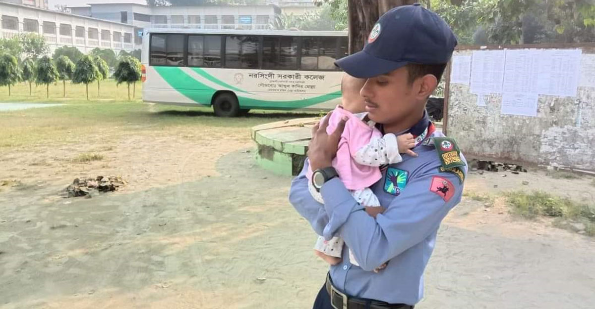 জানা যায়, মঙ্গলবার সকাল ৯টা থেকে দুপুর ১টা পর্যন্ত অনার্স প্রথম বর্ষের ফাইনাল পরীক্ষা ছিল। এ সময় ছোট কোলের বাচ্চা নিয়েই পরীক্ষায় অংশ নিতে আসেন এক মা। শিশুটিকে এক বৃদ্ধার কাছে রেখে মা চলে যান ভেতরে পরীক্ষার হলে। মাকে না পেয়ে শিশুর কান্না কোনোভাবেই থামছিল না। বিষয়টি শৃঙ্খলার দায়িত্বে থাকা রোভার স্কাউট নরসিংদী সরকারি কলেজ শাখার কর্মীদের নজরে এলে দুজন কর্মী গিয়ে সহায়তা করেন এবং পরীক্ষা শেষ হওয়া অব্দি দুজন মিলে বাচ্চাটাকে কোলে করে রাখেন।