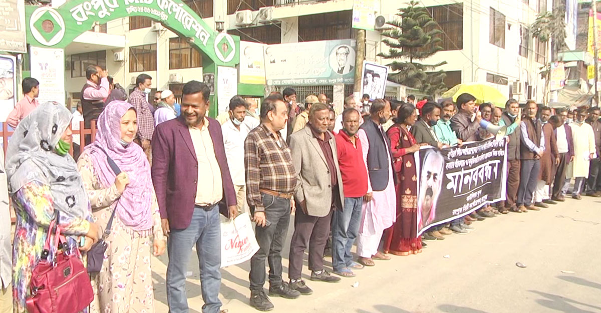 বুধবার (২৪ নভেম্বর) দুপুরে রংপুর সিটি করপোরেশনের প্রধান ফটকের সামনে অনুষ্ঠিত মানববন্ধন সমাবেশ থেকে এ দাবি জানান তারা।