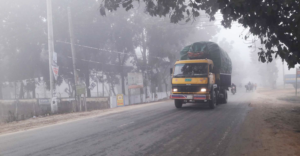 ঘন কুয়াশায় হেডলাইট জ্বালিয়ে চলাচল করছে যানবাহন