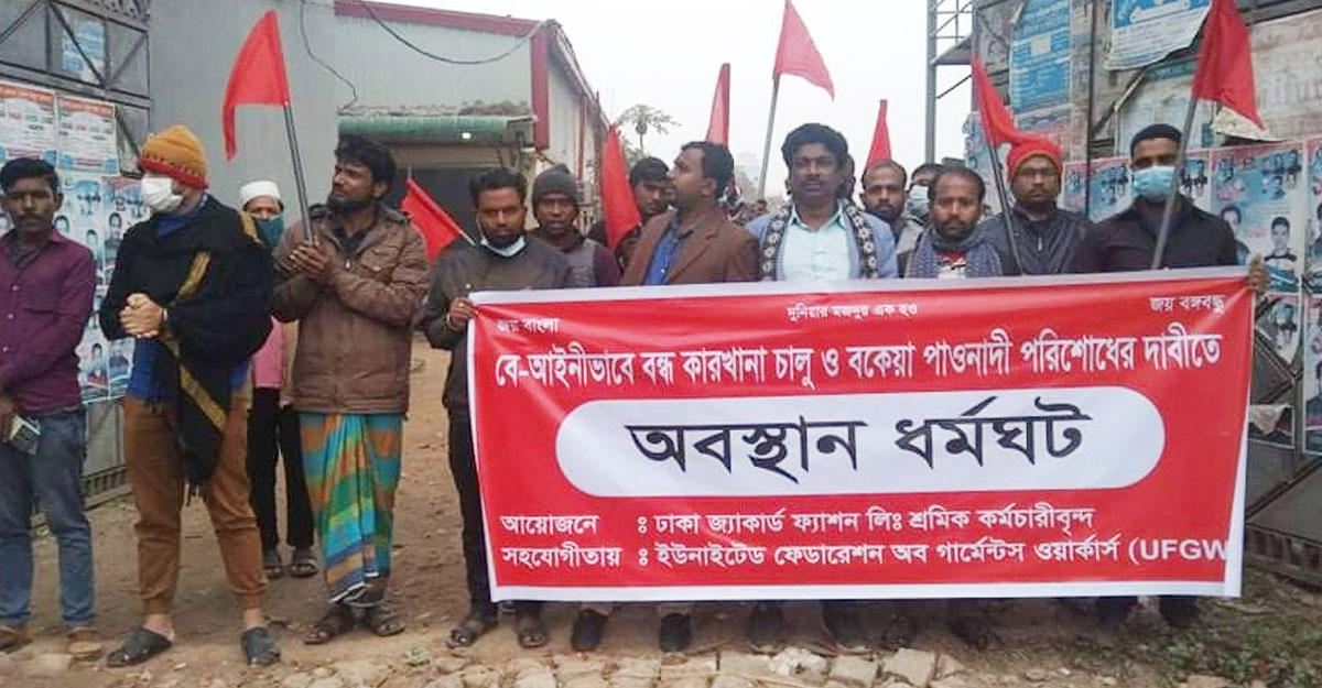 শ্রমিকরা জানান, দীর্ঘদিন ধরে ঢাকা জ্যাকার্ড ফ্যাশন লিমিটেড কারখানায় প্রায় ৭০ জন শ্রমিক কাজ করছেন। গত নভেম্বর মাসের বেতন না দিয়ে ডিসেম্বর মাসের ২২ তারিখে পাঁচদিনের জন্য কারখানা সাধারণ ছুটি ঘোষণা করে কর্তৃপক্ষ। আজও তাদের পাঁচদিন শেষ হয়নি। সরলতার সুযোগ নিয়ে কারখানা কর্তৃপক্ষ শ্রমিকদের বোকা বানিয়েছে। বকেয়া বেতন পরিশোধ না করে প্রায় এক মাস ছয়দিন যাবৎ কারখানা বন্ধ রাখা হয়েছে। দ্রুত বকেয়া বেতন পরিশোধ করে কারখানা খুলে দেওয়ার দাবি জানান তারা।