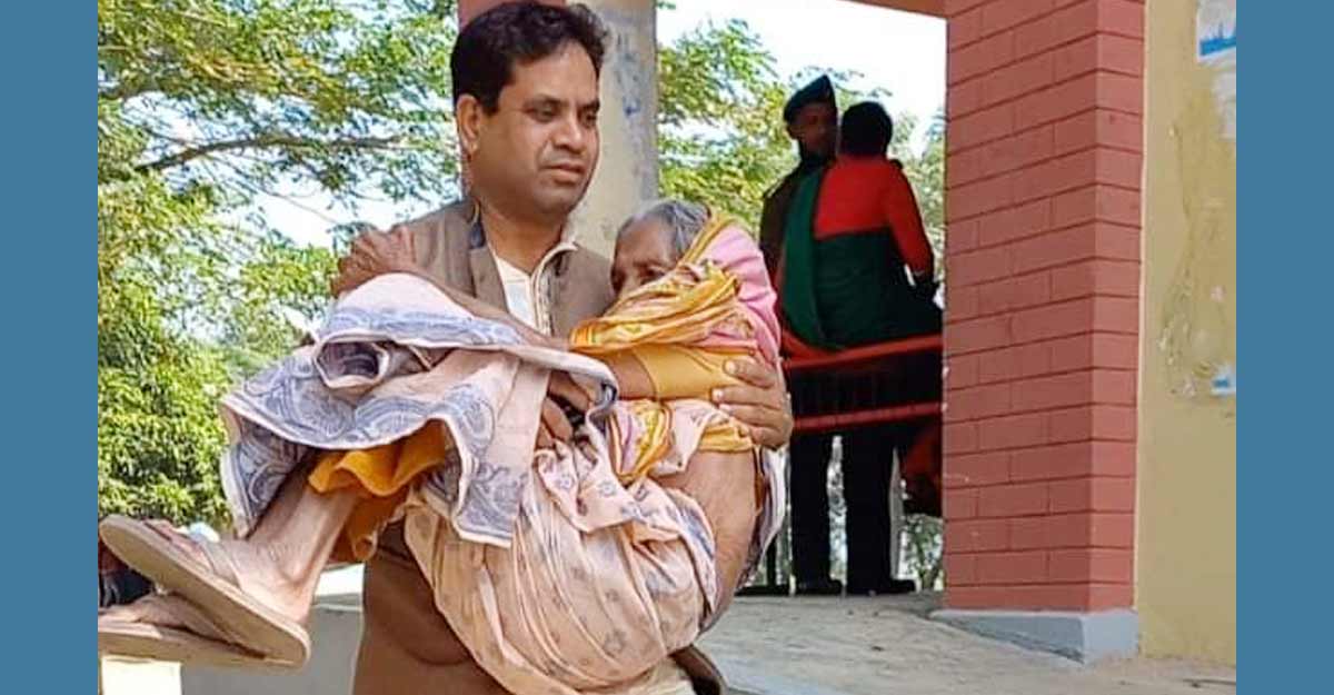 বৃদ্ধাকে কোলে নিয়ে কেন্দ্রে পৌঁছে দিলেন চেয়ারম্যান প্রার্থী