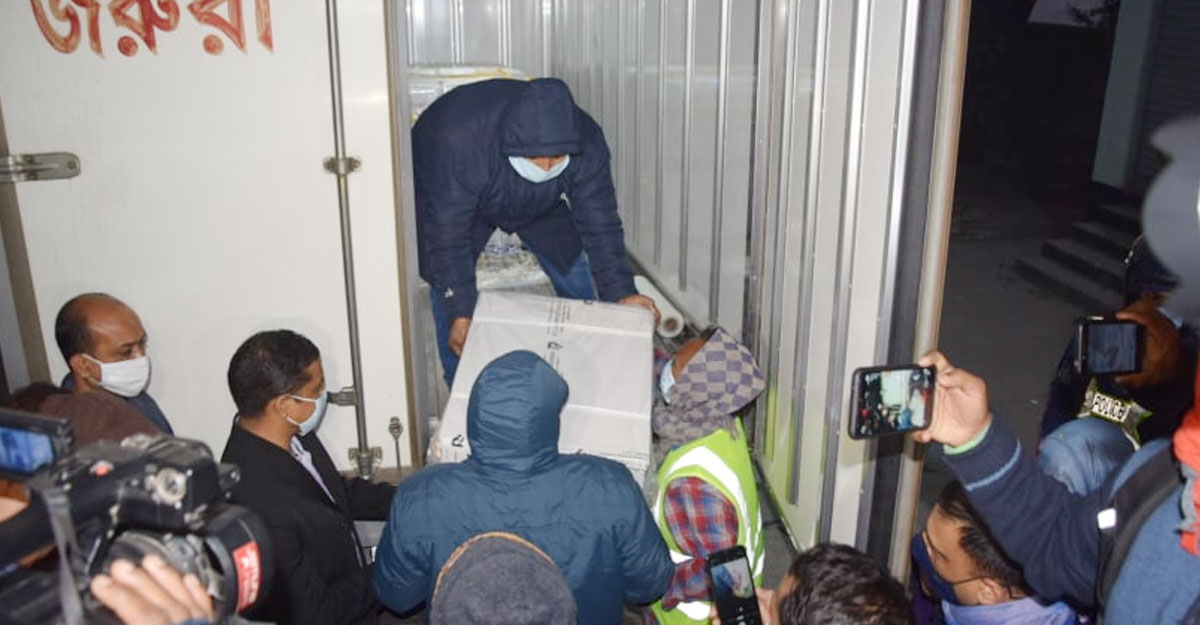 রংপুরে ফ্রিজার ভ্যান থেকে ভ্যাকসিনের কার্টন নামানো হচ্ছে