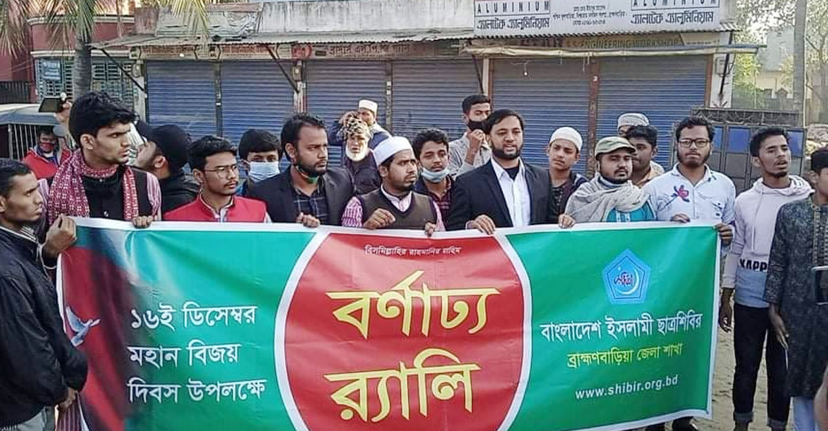 ব্রাহ্মণবাড়িয়ায় মহান বিজয় দিবস উপলক্ষে র্যালি বের করার সময় ইসলামী ছাত্রশিবিরের চার কর্মীকে আটক করা হয়েছে। বৃহস্পতিবার (১৬ ডিসেম্বর) সকাল ১০টার দিকে জেলা শহরের ফুলবাড়িয়া কনভেনশন সেন্টারের সামনে থেকে ছাত্রলীগের নেতাকর্মীরা তাদের আটক করে পুলিশের কাছে সোপর্দ করে।