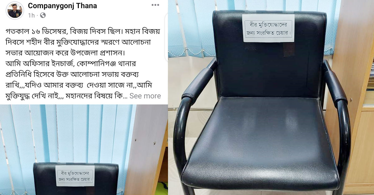 জাতির শ্রেষ্ঠ সন্তান বীর মুক্তিযোদ্ধাদের জন্য থানায় আসন সংরক্ষিত রেখেছেন কোম্পানীগঞ্জ থানার ভারপ্রাপ্ত কর্মকর্তা (ওসি) মো. সাজ্জাদ রোমন।
