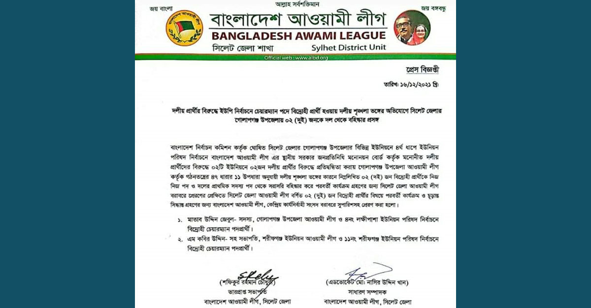 বহিষ্কৃতরা হলেন- গোলাপগঞ্জ উপজেলা আওয়ামী লীগ সদস্য ও লক্ষিপাশা ইউনিয়ন পরিষদ নির্বাচনে বিদ্রোহী প্রার্থী মাতাব উদ্দিন জেবুল এবং শরিফগঞ্জ ইউনিয়ন আওয়ামী লীগ সহসভাপতি ও শরীফগঞ্জ ইউনিয়ন পরিষদ নির্বাচনে বিদ্রোহী প্রার্থী এম কবির উদ্দিন।