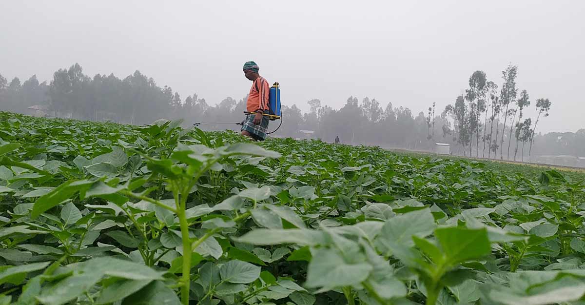 আলু খেতে কীটনাশক ছিটাচ্ছেন এক কৃষক