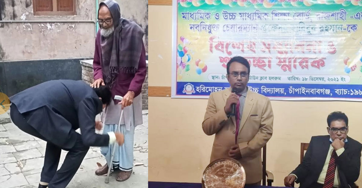 তিনি চাঁপাইনবাবগঞ্জের ঐতিহ্যবাহী শিক্ষাপ্রতিষ্ঠান হরিমোহন সরকারি উচ্চ বিদ্যালয়ের অবসরপ্রাপ্ত প্রধান শিক্ষক মাহতাব উদ্দিন এবং অবসরপ্রাপ্ত শিক্ষক মোজাম্মেল হকেরও পা ছুঁয়ে সালাম করেন। তারা দুজনই তার শিক্ষক। এরপর তিনি হরিমোহন উচ্চ বিদ্যালয়ের সাবেক সহপাঠীদের এক সংবর্ধনা অনুষ্ঠানে অংশ নেন।