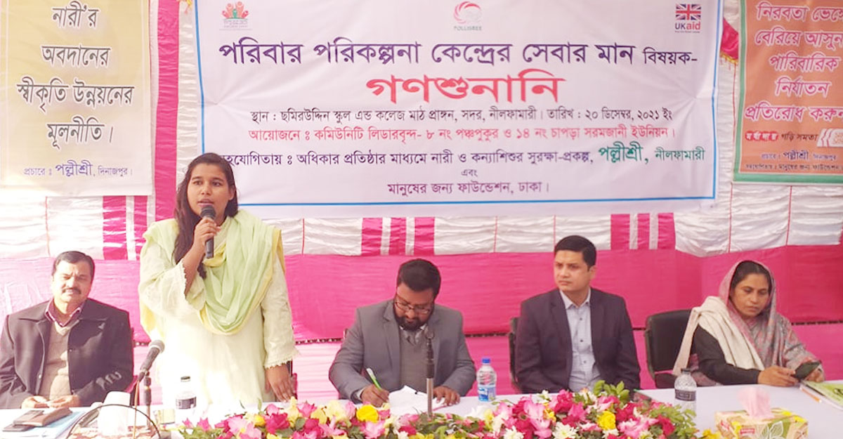 গণশুনানিতে সহযোগিতা করে উন্নয়ন সংস্থা পল্লীশ্রীর অধিকার প্রতিষ্ঠার মাধ্যমে নারী ও কন্যা শিশু সুরক্ষা প্রকল্প।