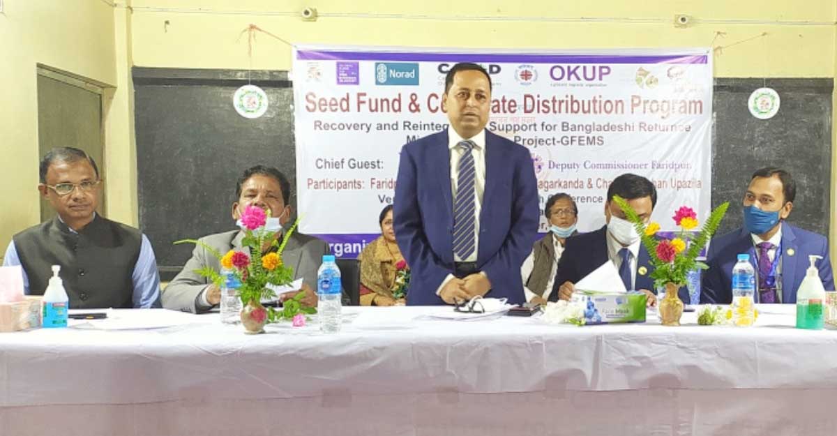 অনুষ্ঠানে মধ্যপ্রাচ্য থেকে ফিরে আসা ফরিদপুরের মধুখালি, সালথা, নগরকান্দা, ফরিদপুর সদর ও চরভদ্রাসন উপজেলার ২৮ জনকে পুনর্বাসন ও আত্মকর্মস্থানের জন্য এ টাকা প্রদান করা হয়। এর মধ্যে ২১ জন নারী এবং ৭ জন পুরুষ।