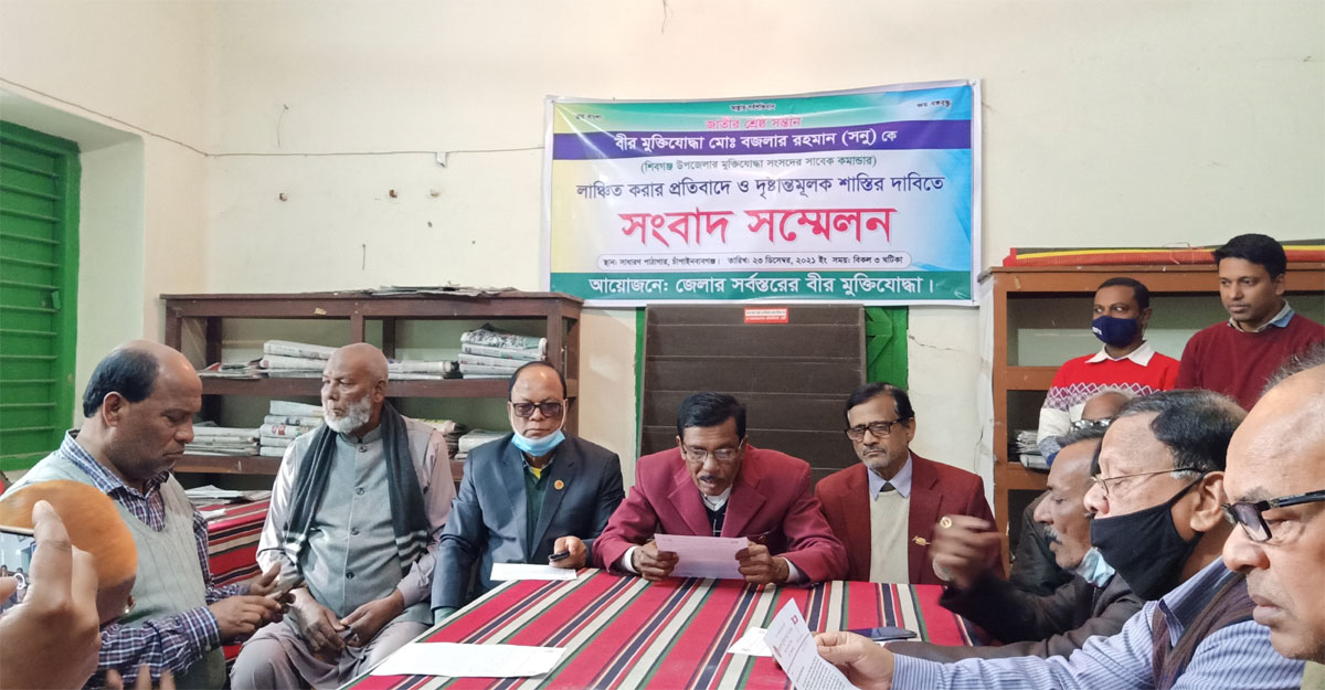 চাঁপাইনবাবগঞ্জে মহান বিজয় দিবস উপলক্ষে অনুষ্ঠিত বীর মুক্তিযোদ্ধাদের সংবর্ধনা অনুষ্ঠানে শিবগঞ্জ উপজেলা মুক্তিযুদ্ধ সংসদের সাবেক কমান্ডার মো. বজলুর রশিদ সনুকে লাঞ্ছিত করার প্রতিবাদে সংবাদ সম্মেলন করেছেন মুক্তিযোদ্ধারা।