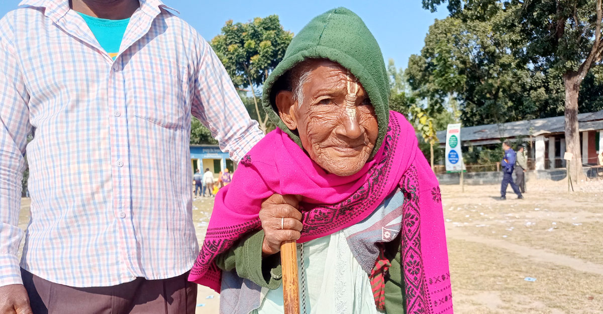 ঠাকুরগাঁও সদর উপজেলার ৫ নং বালিয়া ইউনিয়নের কুমারপুকুর উচ্চ বিদ্যালয় কেন্দ্রে ভোট দিতে এসেছেন শতবর্ষী সাবিত্রী বালা।বয়সের ভারে ঠিকমতো চলাফেরা করতে পারেন না। এক হাতে লাঠি আর অন্য হাতে ছেলেকে ধরে ভোটকেন্দ্রে এসেছেন তিনি।