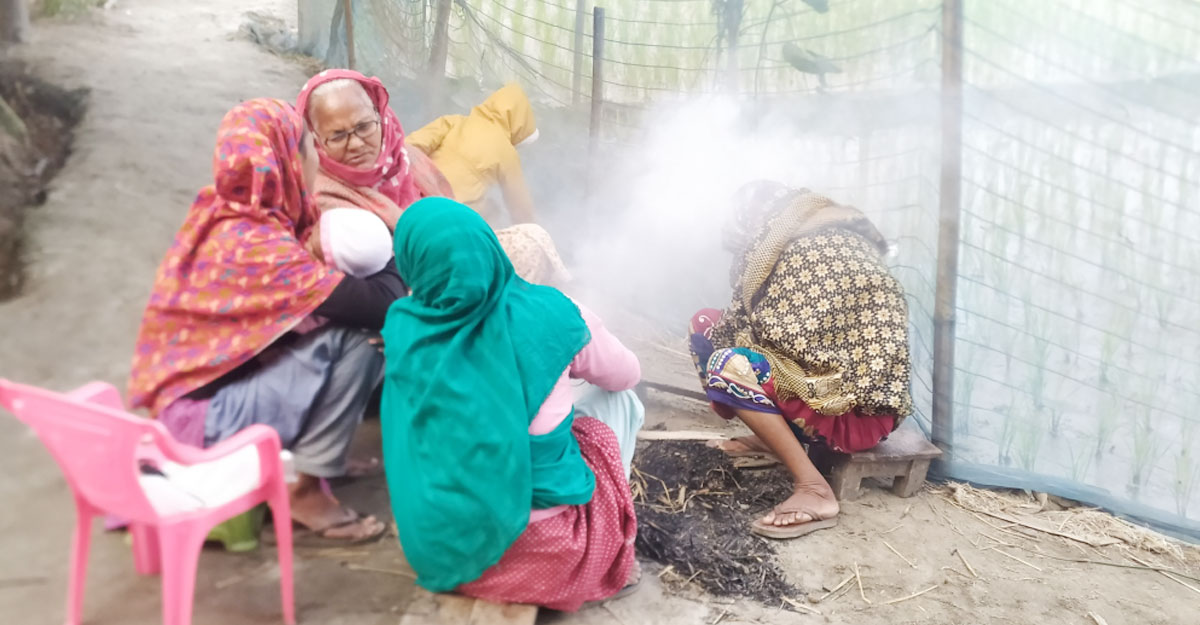 খড়কুটো জ্বালিয়ে শীত নিবারণের চেষ্টা