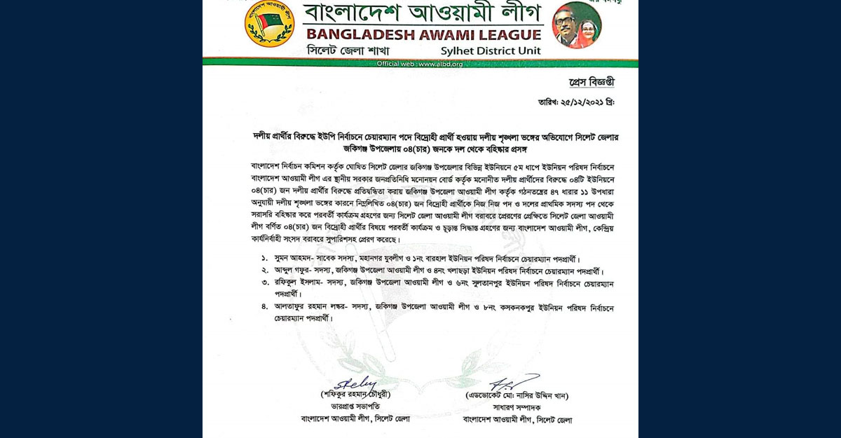 সিলেট জেলা আওয়ামী লীগের ভারপ্রাপ্ত সভাপতি শফিকুর রহমান চৌধুুরী ও সাধারণ সম্পাদক অ্যাডভোকেট নাসির উদ্দিন খান তাদের বহিষ্কার করেন। বহিষ্কারাদেশের একটি কপি সোমবার (২৭ ডিসেম্বর) সংবাদমাধ্যমে পাঠানো হয়।