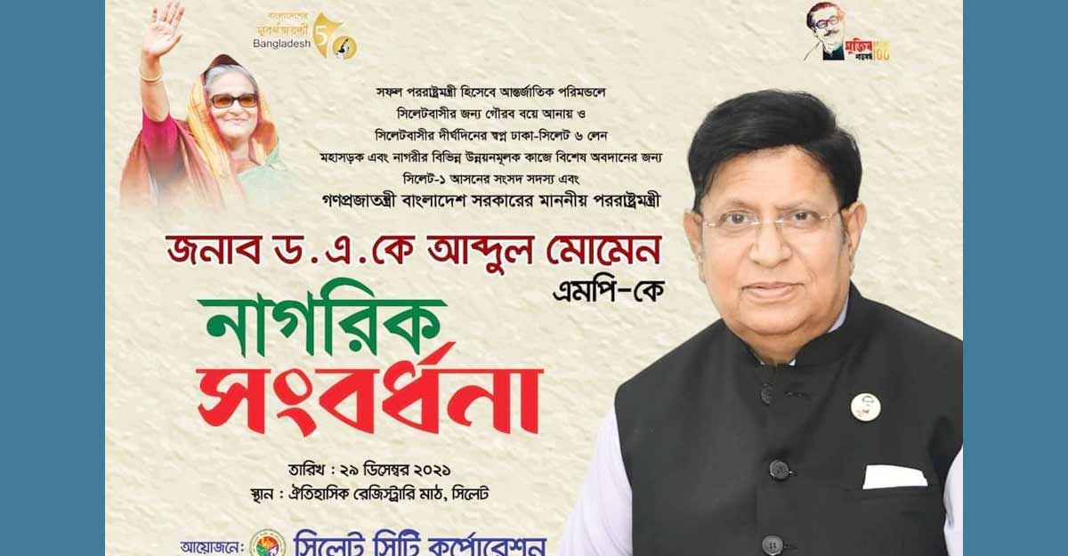 উল্লেখ্য, ঢাকা-সিলেট মহাসড়ক ৬ লেনে উন্নীতকরণ প্রকল্প ও সিলেটের উন্নয়নের বিশেষ অবদান রাখায় সিলেট-১ আসনের সংসদ সদস্য পররাষ্ট্রমন্ত্রী ড. এ কে আব্দুল মোমেনকে নাগরিক সংবর্ধনা প্রদান করছে সিলেট সিটি করপোরেশন।