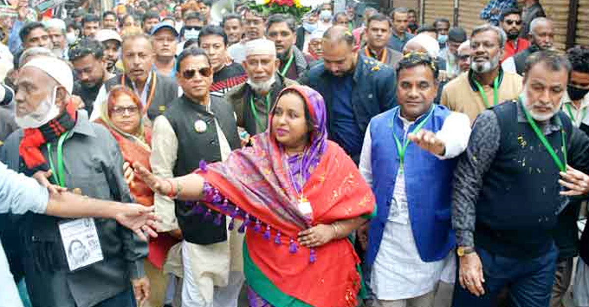 সেলিনা হায়াৎ আইভী সিদ্ধিরগঞ্জের ৮ নং ওয়ার্ডে নির্বাচনী প্রচারণায় আসলে নেতাকর্মীরা ফুল ছিটিয়ে তাকে স্বাগত জানান।