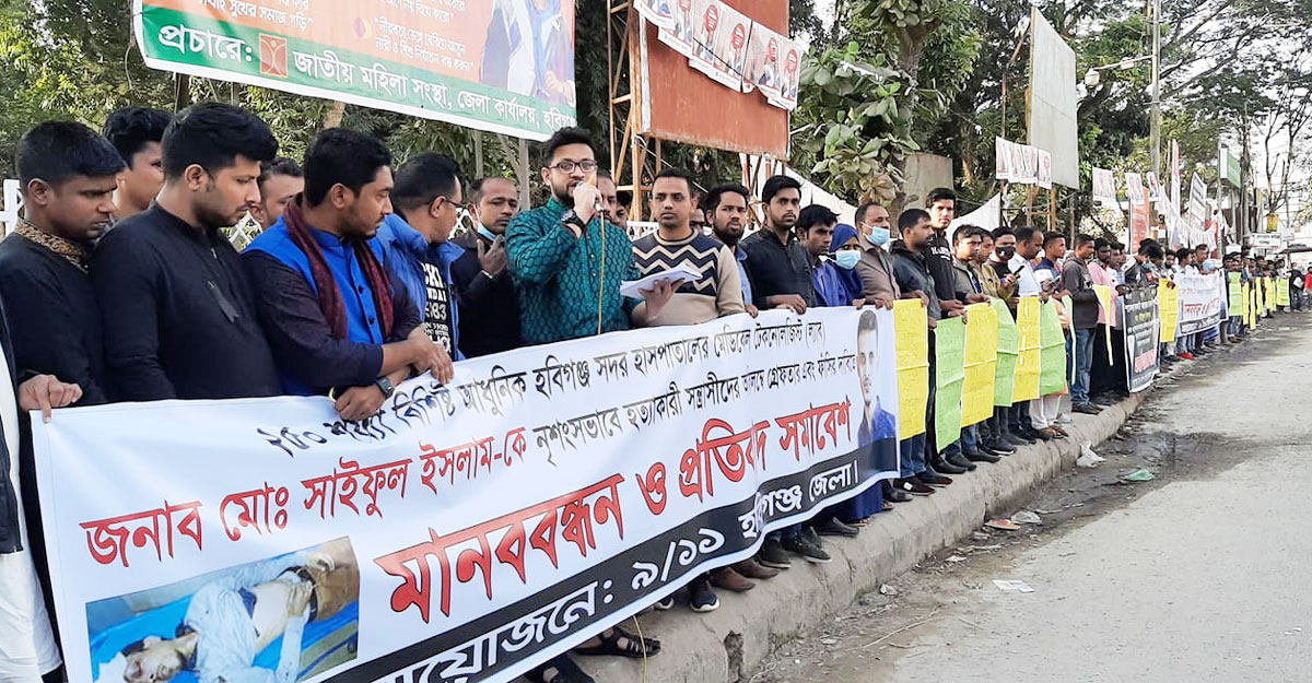 হবিগঞ্জে সদর হাসপাতালের মেডিকেল টেকনোলজিস্ট সাইফুল ইসলামকে দিনে-দুপুরে পিটিয়ে হত্যার প্রতিবাদে ও হত্যাকারীদেরে গ্রেফতারের দাবিতে মানববন্ধন ও বিক্ষোভ করা হয়েছে।
