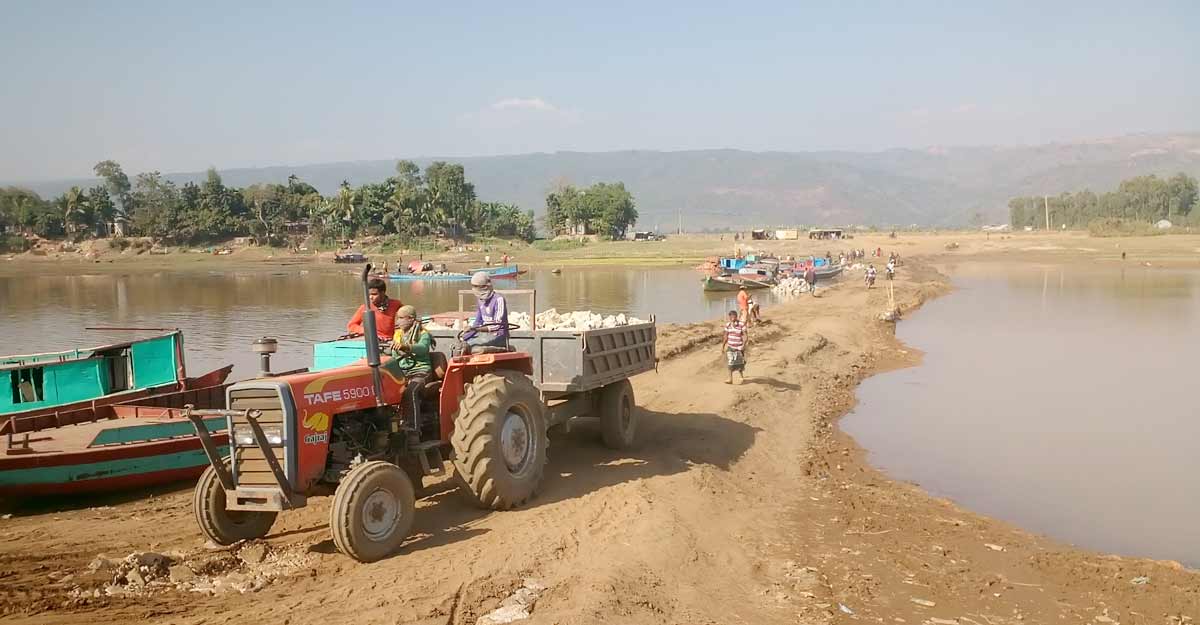 নদীর বুকে রাস্তা, দাপিয়ে চলছে পাথরবোঝাই মাহিন্দ্র