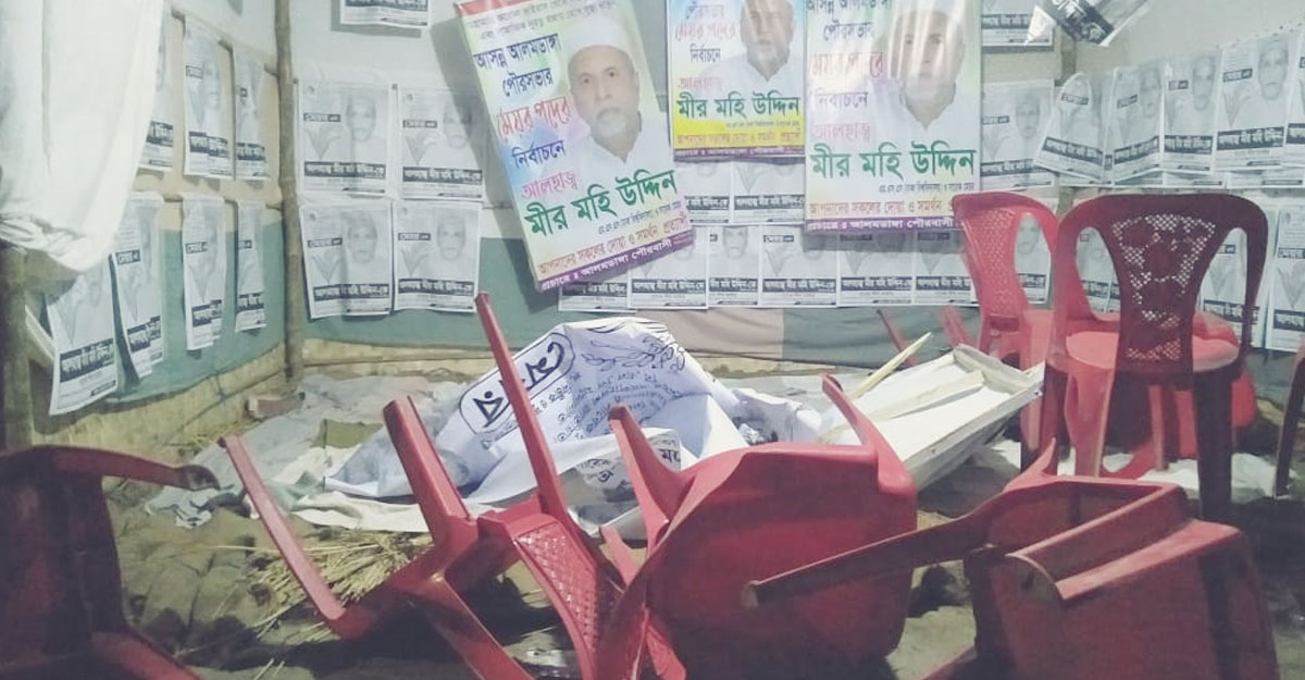 প্রত্যক্ষদর্শীরা জানান, সোমবার রাত ১০টার দিকে কে বা কারা ১৫-২০টি মোটরসাইকেলযোগে আনন্দধাম হাউসপুরে স্বতন্ত্র প্রার্থী বীর মুক্তিযোদ্ধা এম সবেদ আলীর নির্বাচনী অফিস ভাঙচুর করে। এ সময় অফিসে ৭-৮ জন স্বতন্ত্র প্রার্থীর সমর্থক বসে কথা বলছিলেন। হঠাৎ তারা অফিসে প্রবেশ করে ভাঙচুর করেই মোটরসাইকেল নিয়ে স্থান ত্যাগ করেন। প্রায় একই সময়ে পৌরসভার ৯ নম্বর ওয়ার্ডের বন্ডবিলে বিএনপির প্রার্থী মীর মহিউদ্দিনের নির্বাচনী অফিসও ভাঙচুর করেন এক দল যুবক।
