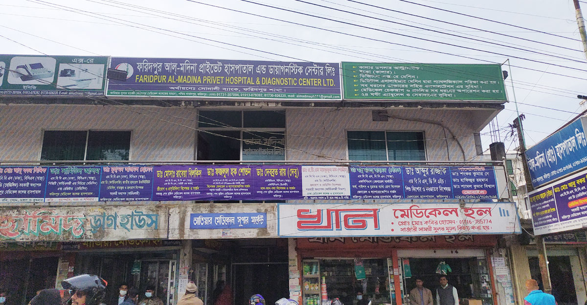প্রসঙ্গত, আল মদিনা প্রাইভেট হাসপাতাল এন্ড ডায়গনস্টিক সেন্টার শহরের পশ্চিম খাবাসপুর মহল্লায় বঙ্গবন্ধু শেখ মুজিব মেডিকেল কলেজ হাসপাতালের বিপরীত দিকে ঢাকা-বরিশাল মহাসড়কের পশ্চিম পাশে অবস্থিত। এ হাসপাতালটি স্থাপিত হয় ২০০৭ সালে।২০১৫ সাল থেকে এ হাসপাতালের লাইসেন্স নবায়ন করা হয়নি।