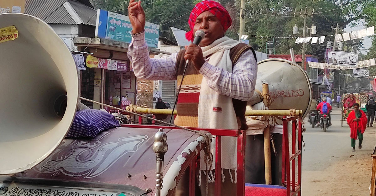 একটি হ্যান্ডমাইক হাতে নিয়ে একাই নিজের প্রচারে বেরিয়ে পড়ছেন ভোটারের কাছে। কখনো পায়ে হেঁটে, কখনো সাইকেলে, কখনো অটোরিকশায় করে পথঘাট, হাটবাজার ও বন্দরে। মোটরসাইকেল প্রতীকে ভোট চাচ্ছেন ভোটারদের বাড়ি বাড়ি গিয়েও।