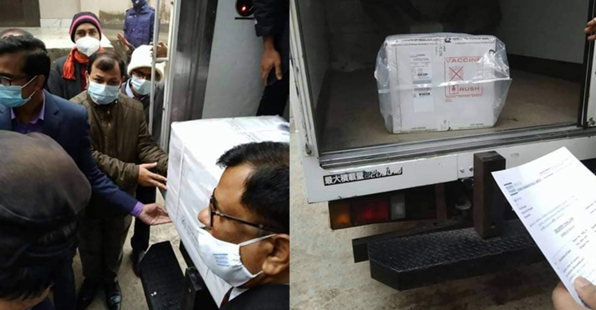 ব্রাহ্মণবাড়িয়া জেলার পক্ষে সিভিল সার্জন ডা. মোহাম্মদ একরাম উল্লাহ টিকাগুলো গ্রহণ করেন; ২৯ জানুয়ারি তোলা ছবি।