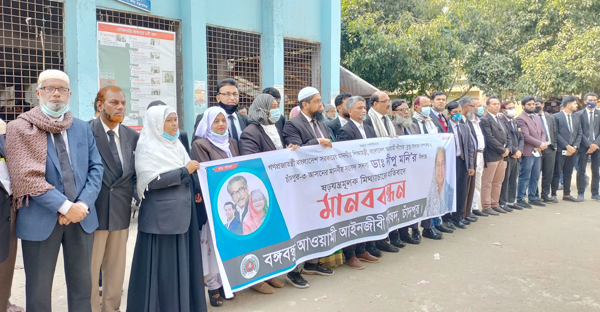চাঁদপুর জেলা ও দায়রা জজ আদালতের পাবলিক প্রসিকিউটর অ্যাডভোকেট রনজিৎ রায় চৌধুরীর সভাপতিত্বে ও বঙ্গবন্ধু আওয়ামী আইনজীবী পরিষদ চাঁদপুর জেলা শাখার সাধারণ সম্পাদক সাইয়েদুল ইসলাম বাবুর পরিচালনায় মানববন্ধনে বক্তব্য দেন জেলা আইনজীবী সমিতির সাধারণ সম্পাদক আবদুল্লাহ আল মামুন, জেলা আইনজীবী সমিতির সাবেক সভাপতি শেখ জহিরুল ইসলাম, অ্যাডভোকেট আবদুর রহমান, অ্যাডভোকেট রোমানা আফরোজ, অ্যাডভোকেট হুমায়ুন কবির সুমন প্রমুখ।