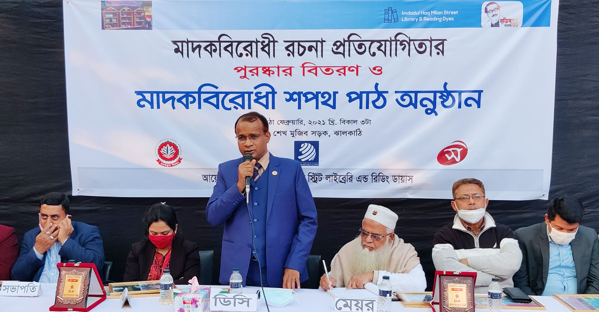 মাদক ছেড়ে পাঠাভ্যাস গড়তে ঝালকাঠিতে মাদকবিরোধী রচনা প্রতিযোগিতার পুরস্কার বিতরণ ও মাদকবিরোধী শপথ পাঠ অনুষ্ঠিত হয়েছে। ইমদাদুল হক মিলন স্ট্রিট লাইব্রেরি অ্যান্ড রিডিং ডায়াস বৃহস্পতিবার (৪ ফেব্রুয়ারি) বিকেলে শহরের শেখ মুজিব সড়কে এ আয়োজন করে।