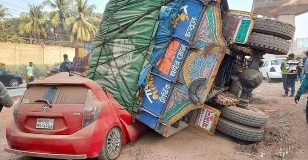 প্রাইভেট কারের ওপর উল্টে পড়ল মালবোঝাই ট্রাক