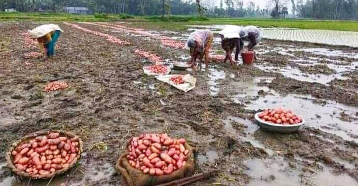 শীতময় মাঘ মাসে হঠাৎ এমন বৈরী আবহাওয়ার কারণে বৃষ্টির পানি জমে থাকা খেত থেকে কোমর বেঁধে আলু তুলতে নেমে পড়েছেন কৃষকরা। এবার আলুর ফলন বাম্পার হলেও বাজার দর আর হঠাৎ বৃষ্টির প্রভাবে কৃষকের মুখে হাসি নেই। মৌসুমরে শুরুতে আগাম জাতের আলু প্রতি বস্তা (৯০ কেজি) দেড় হাজার থেকে দুই হাজার টাকা দরে বিক্রি করা হলেও গত দুই সপ্তাহ থেকে বাজারে ধস নেমেছে।