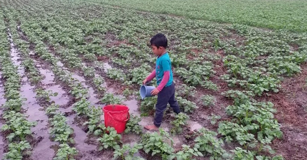 কৃষক আনোয়ার হোসেন তার তিন বছরের ছেলে তামিমকে নিয়ে জমির কোণে গর্ত করে সেই গর্তের মধ্যে পানি সেঁচের কাজ করছেন। আনোয়ার বলেন, আগে রোপণ করা আলু তলিয়ে যাওয়ার পর ধারদেনা করে আবার আলু রোপণ করলাম। এখন আবারও বৃষ্টিতে তলিয়ে গেল সব । ধারদেনা কোথা হতে দিব? সরকার যদি সহয়তা করত, তাহলে বাঁচতে পারতাম।