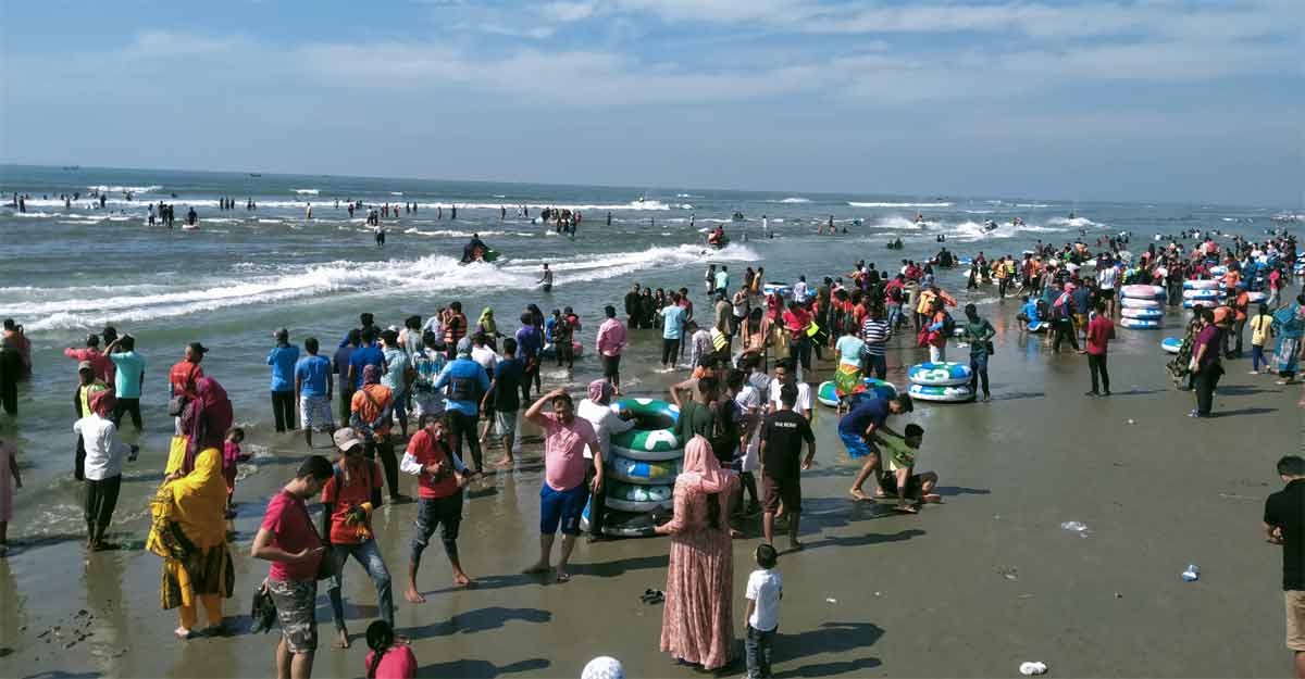 শনিবার বিকেলে সরেজমিনে দেখা যায়, সৈকত লোকে লোকারণ্য। আনন্দ ও উচ্ছ্বাসে উবে গেছে করোনার ভয়। সাগরের ঢেউয়ের সঙ্গে খেলা করছেন পরিবারের সব সদস্য মিলে।