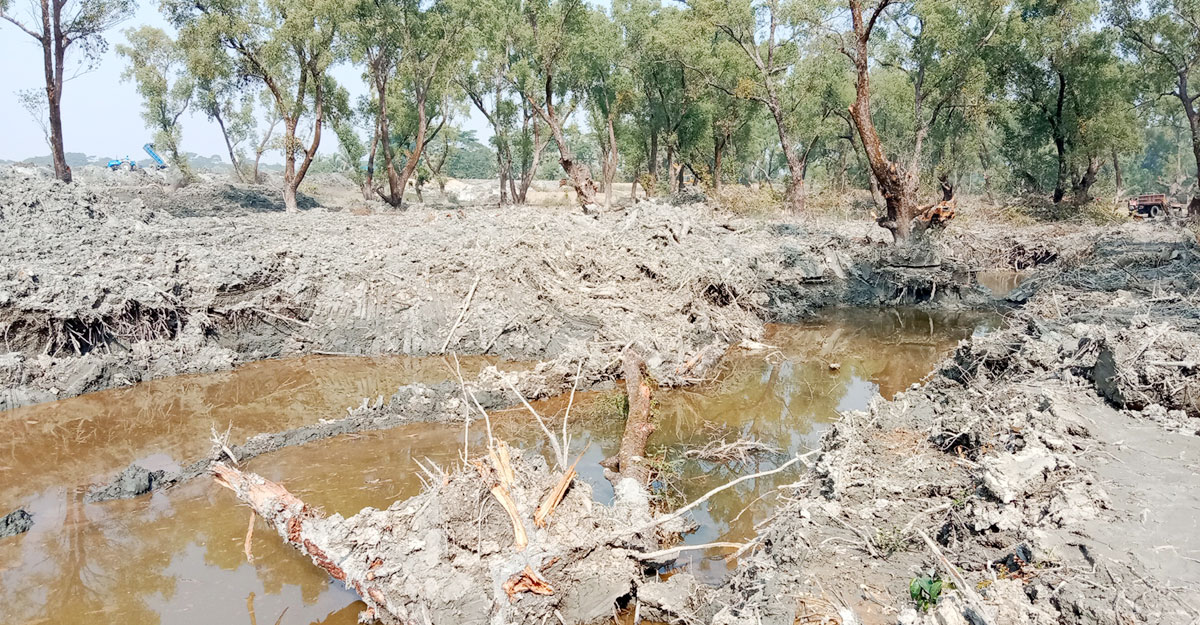 সরেজমিনে দেখা গেছে, কুয়াকাটার ৪৮ নং পোল্ডারের খাজুরা ও গঙ্গামতি সংরক্ষিত বনের মাঝখানে বড় বড় দিঘি কাটা হয়েছে। আবার কোথাও কোথাও খাল কেটে মাটি নেওয়া হয়েছে। পানি উন্নয়ন বোর্ডের বেড়িবাঁধের স্লোভ থেকে প্রায় ৪০০-৫০০ মিটার বনের ভেতর থেকে গাছ উপড়ে মাটি নেওয়া হয়েছে। এখনও চলমান রয়েছে এসব ধ্বংসযজ্ঞ।