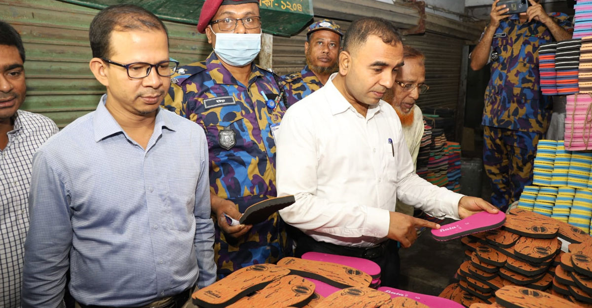 তিনি জানান, রাজধানীর পোস্তগোলা এলাকায় আজ অভিযান পরিচালনা করা হয়। এ সময় আলম সুপার মার্কেটের নিচ তলায় এপেক্সের লোগো হুবহু নকল করে এবং বাটার লোগো অনুকরণ করে ‘বালা’ নামে স্যান্ডেল তৈরি করতে দেখা যায়। এসব সেন্ডেল তৈরির বিভিন্ন উপকরণ স্পটে ধ্বংস করা হয় এবং অভিযুক্ত কারখানা মালিককে ৫০ হাজার টাকা জরিমানা করা হয়। একই সঙ্গে প্রতিষ্ঠানটির সব ধরনের কার্যক্রম জনস্বার্থে সাময়িকভাবে বন্ধ রাখার নির্দেশ দেওয়া হয়।