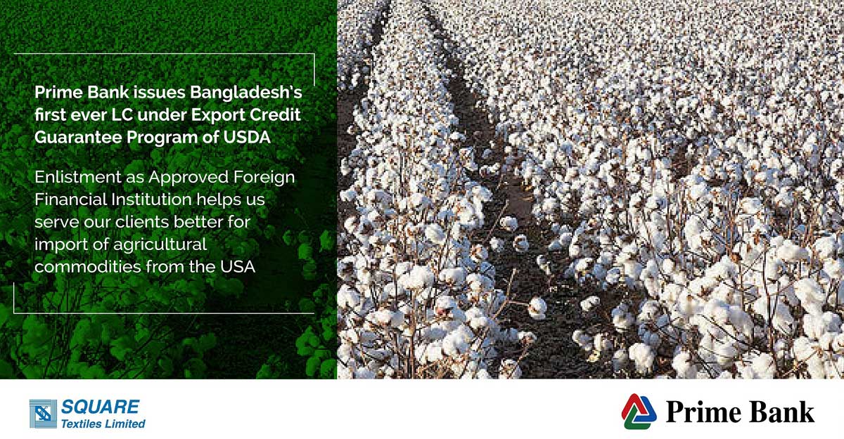 সম্প্রতি প্রাইম ব্যাংক, এই প্রোগ্রামের অধীনে মার্কিন যুক্তরাষ্ট্র থেকে স্কয়ার টেক্সটাইল লিমিটেডের জন্য কাঁচা তুলা আমদানিতে প্রথম এলসি সফলভাবে ইস্যু করেছে।