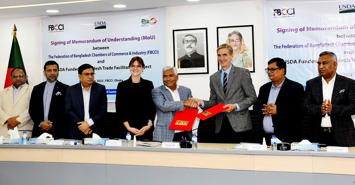 বিশ্ববাজারে বাংলাদেশের কৃষি, মৎস্য ও প্রক্রিয়াজাত খাদ্য রপ্তানি সম্ভাবনাকে কাজে লাগাতে ইউএসডিএ (ইউনাইটেড স্টেট ডিপার্টমেন্ট অব এগ্রিকালচার) ফান্ডেড বাংলাদেশ ট্রেড ফ্যাসিলিটেশন (বিটিএফ) প্রকল্পের সঙ্গে সমঝোতা স্মারক সই করেছে দেশের ব্যবসায়ীদের শীর্ষ সংগঠন এফবিসিসিআই।