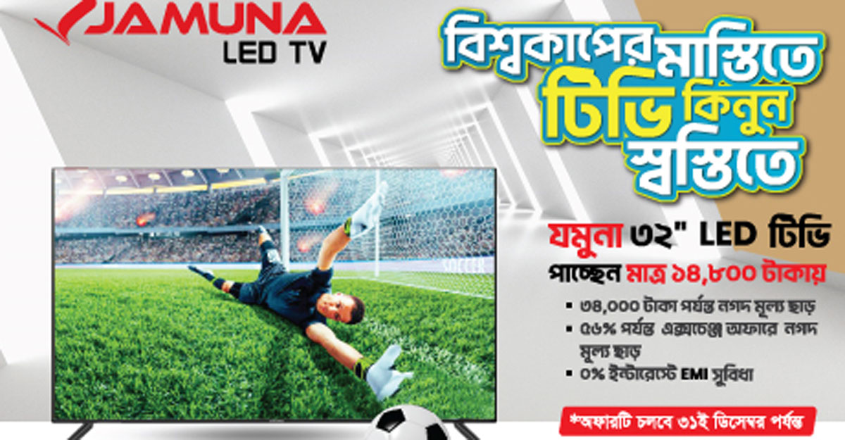 ‘বিশ্বকাপের মাস্তিতে, খেলা দেখুন স্বস্তিতে’ এই স্লোগানকে সামনে রেখে বিভিন্ন মডেলের যমুনা এল ই ডি টিভি কিনলেই ক্রেতাগণ পাবেন ৪৪% পর্যন্ত ডিসকাউন্ট সুবিধা। বিগ সাইজ বিগ অফারে ৫৫ ইঞ্চি টিভি কিনলেই পাচ্ছেন নগদ ৩৪ হাজার টাকা মূল্য ছাড়। আরও আছে ০% ইন্টারেস্টে ই এম আই সুবিধা। এছাড়া সহজ কিস্তিতেও টিভি কিনতে পারবেন ক্রেতাগণ।