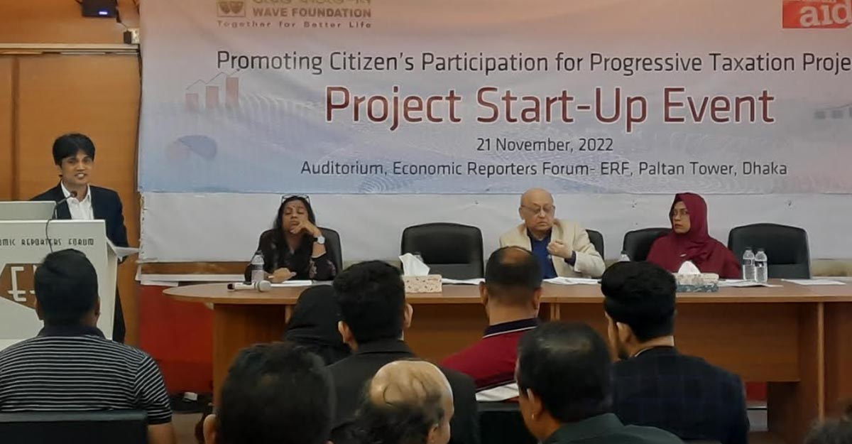 সোমবার (২১ নভেম্বর) ইকোনমিক রিপোর্টার্স ফোরাম (ইআরএফ) মিলনায়তনে ওয়েভ ফাউন্ডেশন ও ক্রিশ্চিয়ান এইডের সহায়তায় আয়োজিত এক বছর মেয়াদি প্রোমোটিং সিটিজেনস্ পার্টিসিপেশন ফর প্রোগ্রেসিভ ট্যাক্সেশন প্রকল্পের ‘স্টার্ট-আপ ইভেন্ট’ শীর্ষক সেমিনারে বক্তারা এসব কথা বলেন।