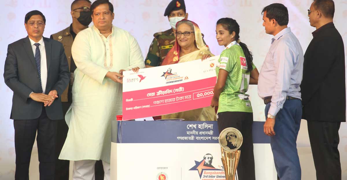 সম্প্রতি রাজধানীর আর্মি স্টেডিয়ামে প্রতিযোগিতার সমাপনী অনুষ্ঠানে প্রধানমন্ত্রী শেখ হাসিনা বিজয়ীদেরকে বিকাশের মাধ্যমে দেওয়া পুরস্কারের অর্থের স্মারক, পদক ও ট্রফি তুলে দেন।