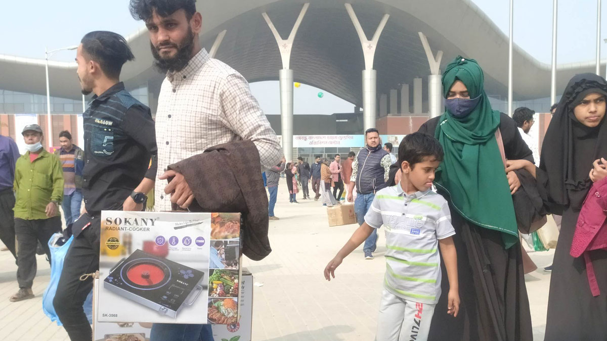 ঢাকা আন্তর্জাতিক বাণিজ্য মেলায় ক্রেতা-দর্শনার্থীরা শূন্য হাতে প্রবেশ করলেও বের হচ্ছেন ব্যাগভর্তি পছন্দের জিনিসপত্র নিয়ে। হাসি মুখ আর হাত ভরা ব্যাগে দর্শনার্থীদের তৃপ্তি ফুটে উঠেছে। পোশাক আর কসমেটিকসেই ব্যাগ ভরিয়েছেন অধিকাংশ দর্শনার্থী। কেউ কেউ আবার শিশুদের খেলনা কেনায় মনোযোগ দিয়েছেন।