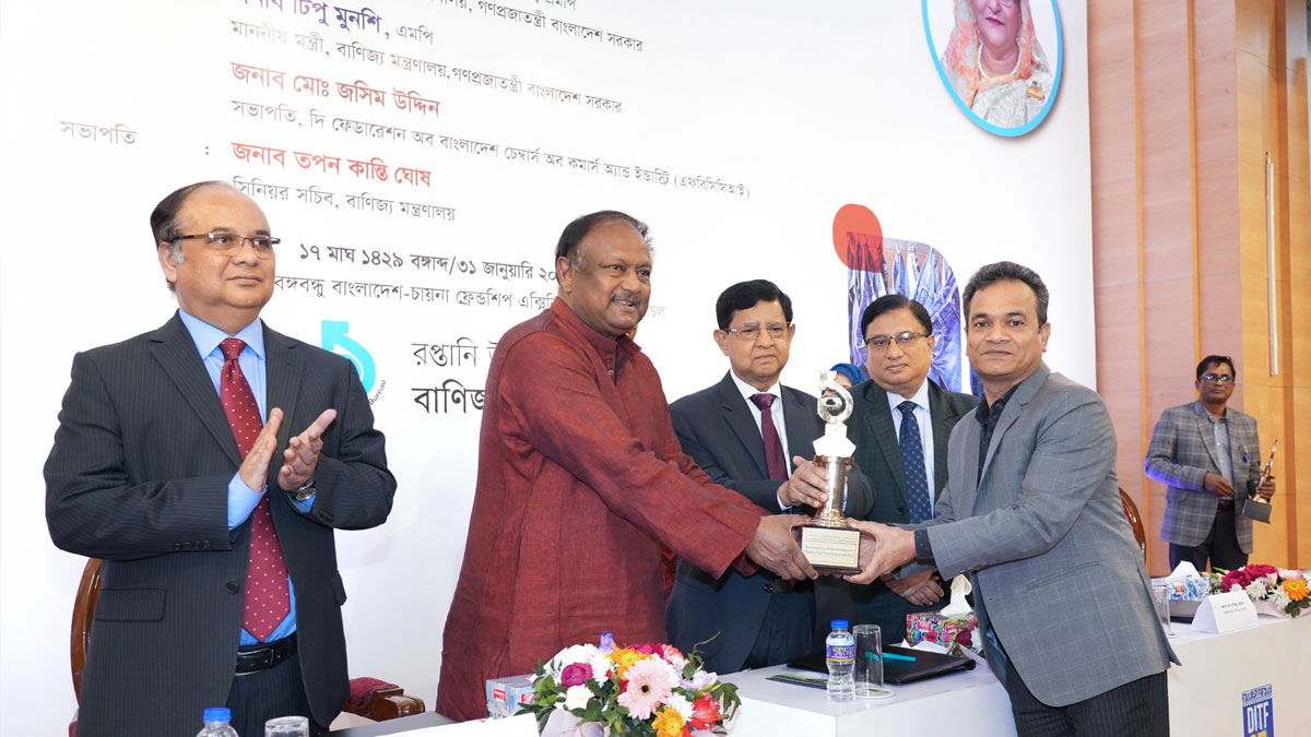 বাণিজ্য মেলায় ইলেকট্রনিক্স ক্যাটাগরিতে সেরা প্রিমিয়ার স্টল পুরস্কারের ক্রেস্ট ও সনদ গ্রহণ করছেন ওয়ালটন হাই-টেক ইন্ডাস্ট্রিজ পিএলসি’র ডেপুটি ম্যানেজিং ডিরেক্টর মো. হুমায়ুন কবীর
