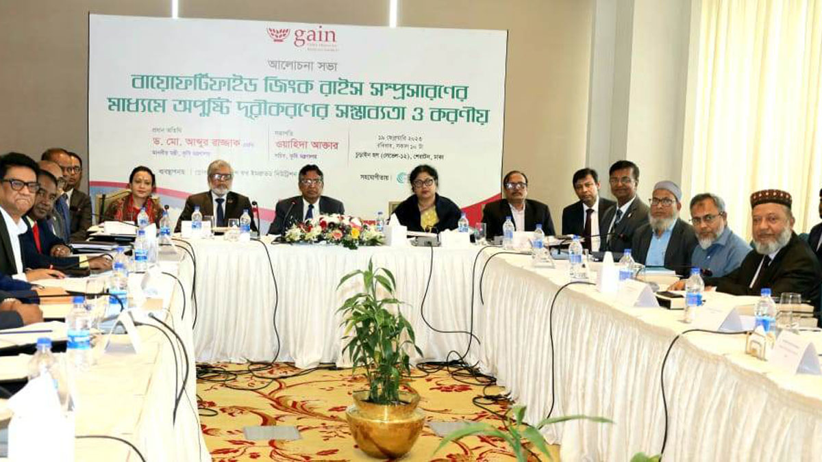 রোববার (১৯ ফেব্রুয়ারি) রাজধানীর একটি হোটেলে বায়োফর্টিফাইড জিঙ্ক রাইস সম্প্রসারণের মাধ্যমে অপুষ্টি দূরীকরণে সম্ভাবতা ও করণীয় শীর্ষক আলোচনা সভায় এ কথা বলেন বক্তারা। এতে প্রধান অতিথি ছিলেন কৃষিমন্ত্রী ড. মো. আব্দুর রাজ্জাক। আলোচনা সভায় সভাপতিত্ব করেন কৃষিসচিব ওয়াহিদা আক্তার। গস্নোবাল অ্যালায়েন্স ফর ইম্প্রুভড নিউট্রিশন (গেইন) বাংলাদেশ এ আলোচনা সভার আয়োজন করে। সহযোগিতায় ছিলো এম্পিরিক রিসার্স লিমিটেড।