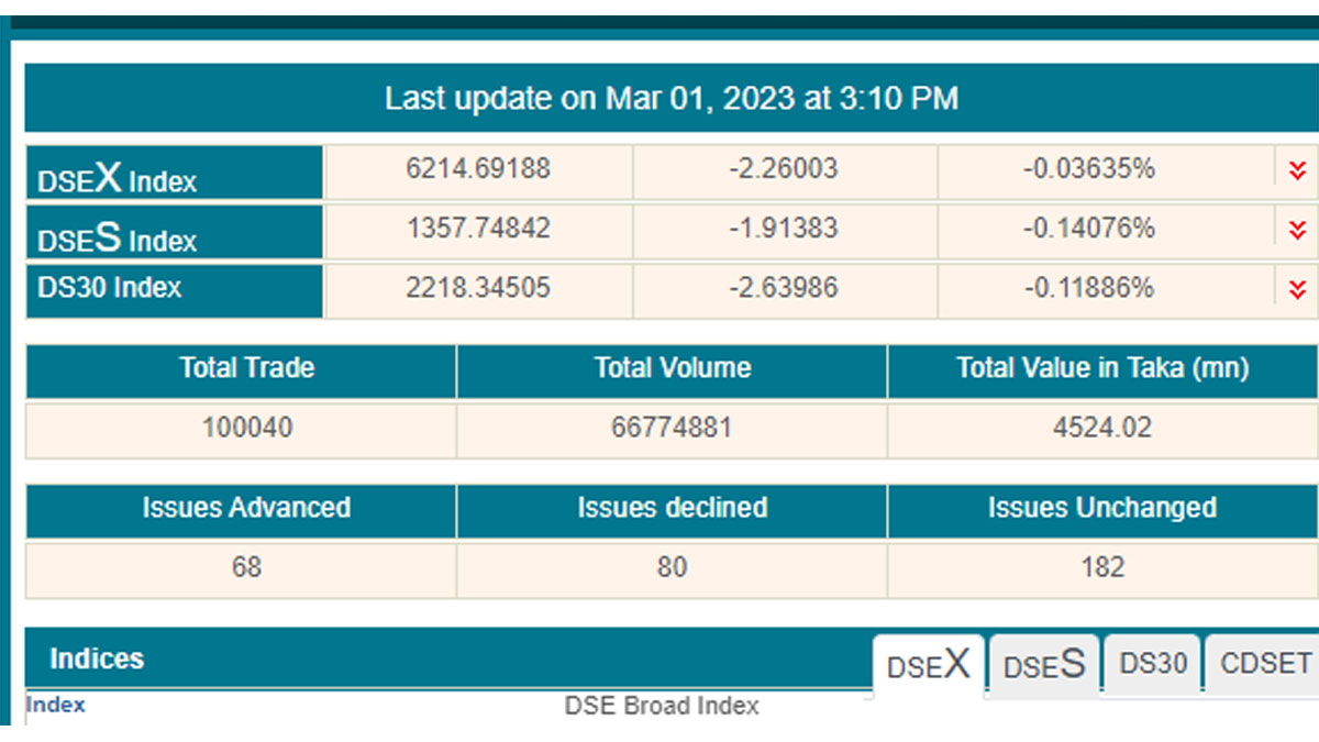 ডিএসইর প্রধান সূচক ডিএসইএক্স আগের দিনের চেয়ে ২ পয়েন্ট কমে দাঁড়িয়েছে ৬ হাজার ২১৪ পয়েন্টে। ডিএসইএস শরিয়াহ্ সূচক আগের দিনের তুলনায় ১ দশমিক ৯১ পয়েন্ট কমে ১ হাজার ৩৫৭ পয়েন্টে এবং ডিএসই-৩০ সূচক আগের দিনের তুলনায় ২ পয়েন্ট কমে ২ হাজার ২১৮ পয়েন্টে অবস্থান করছে।