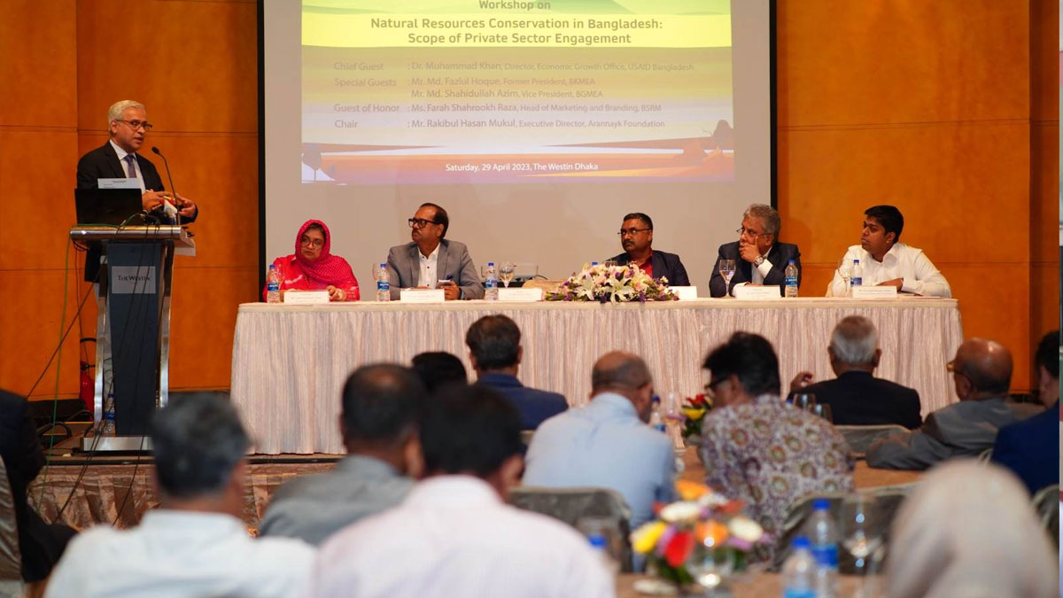 কর্মশালায় মূল প্রবন্ধ উপস্থাপন করেন আরণ্যক ফাউন্ডেশনের হেড অব প্রোগ্রামস মাসুদ আলম খান। তিনি জানান, প্রাকৃতিক দুর্যোগে প্রায় প্রতিবছরই দেশের চারভাগের এক ভাগ প্লাবিত হয়। এই দুর্যোগের পরিমাণ ও তীব্রতা না কমাতে পারলে দেশের অর্থনৈতিক অগ্রগতি ধরে রাখা সম্ভব হবে না। এজন্য পরিবেশ ও বাস্তুসংস্থান সংরক্ষণে ব্যক্তি খাতের নিবিড় সম্পৃক্ততা প্রয়োজন। বিশেষ করে ইকো ট্যুরিজম, স্থানীয় জনগোষ্ঠীভিত্তিক সংগঠনগুলোর সঙ্গে ব্যবসা প্রতিষ্ঠানের অংশীদারিত্ব স্থাপন, সিএসআর কার্যক্রমের পরিধি বাড়ানোর ব্যাপক সুযোগ রয়েছে বলে মনে করেন মাসুদ আলম খান।