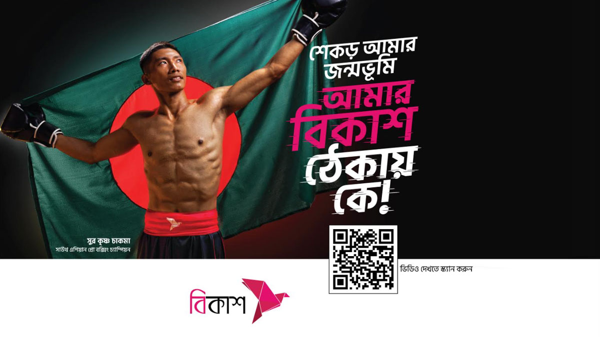 ‘আমার বিকাশ ঠেকায় কে’ শিরোনামে একটি গানের ভিডিও প্রকাশ করেছে মোবাইল আর্থিক সেবাদাতা প্রতিষ্ঠান বিকাশ। এতে উঠে এসেছে বাংলাদেশের সাধারণ মানুষের লড়াকু জীবনের গল্প। গানের মূল চরিত্র দেশের প্রথম পেশাদার বক্সার সুর কৃষ্ণ চাকমা। শত বাধা পেরিয়ে রাঙ্গামাটি থেকে উঠে আসা এই তরুণ কিভাবে পেশাদার বক্সার হয়ে উঠলেন এবং বাংলাদেশকে নিয়ে গেলেন বিশ্ব দরবারে, গানটির উপজীব্য তাই।