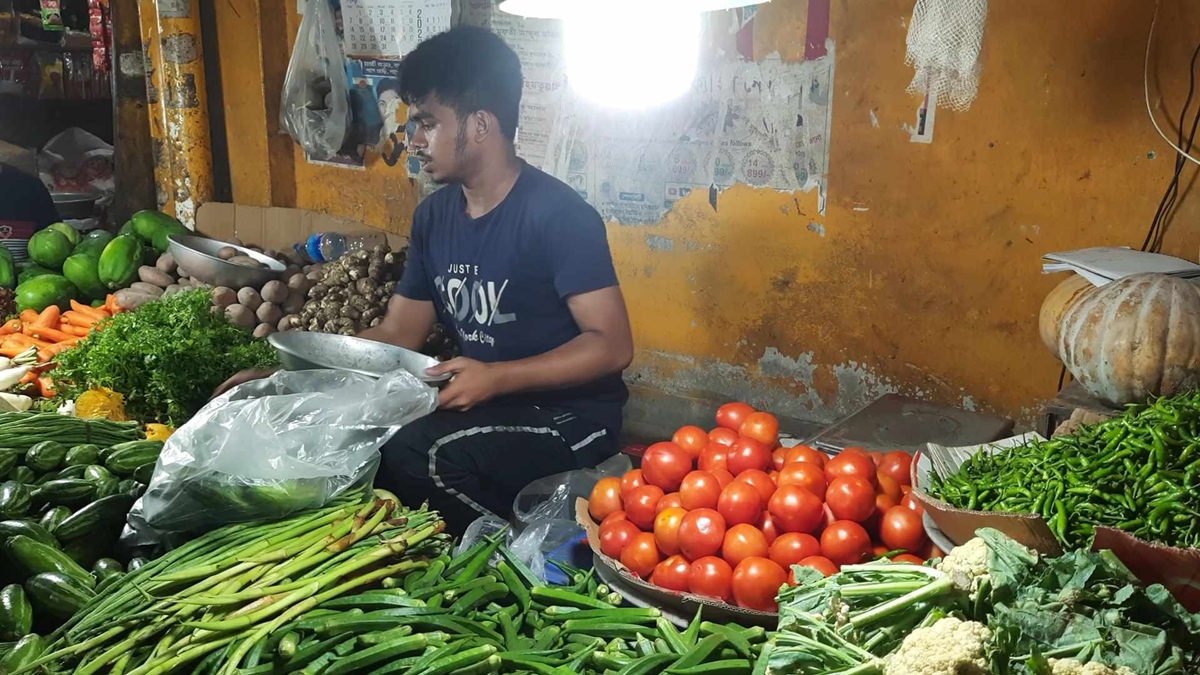 বাজারের প্রবেশ মুখেই, আলু, পটল, চিচিঙ্গা, টমেটোসহ অন্যান্য সবজি সাজিয়ে বসেছেন আকবর আলী। সবজির দাম বেশি প্রসঙ্গে এই বিক্রেতা বলেন, বাজারে সবজির সরবরাহ মোটামুটি কম। যেরকম চাহিদা আছে, তার চেয়ে যদি সরবরাহ কম থাকে দাম তো বেশিই হবে।