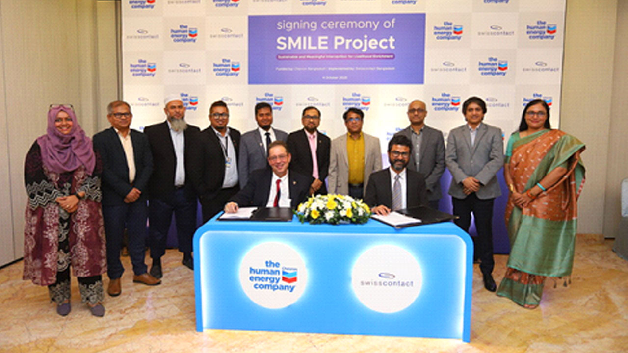 শেভরন বাংলাদেশ এবং সুইস কন্ট্যাক্ট বাংলাদেশ আনুষ্ঠানিকভাবে স্মাইল (সাসটেইনেবল অ্যান্ড মিনিংফুল ইন্টারভেনশন ফর লাইভলিহুড এনরিচমেন্ট) প্রকল্পের অংশীদারিত্ব চুক্তি সই করেছে।