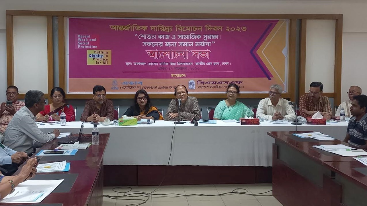 মঙ্গলবার (১৭ অক্টোবর) জাতীয় প্রেসক্লাবের তফাজ্জল হোসেন মানিক মিয়া হলে আন্তর্জাতিক দারিদ্র্য বিমোচন দিবস ২০২৩ উপলক্ষ্যে 'শোভন কাজ ও সামাজিক সুরক্ষা : সকলের জন্য সমান মর্যাদা' শীর্ষক আলোচনা সভায় তিনি এসব কথা বলেন। অ্যাসোসিয়েশন অব ডেভেলপমেন্ট এজেন্সিজ ইন বাংলাদেশ (এডাব) এবং বাংলাদেশ মানবাধিকার সাংবাদিক ফোরাম (বিএমএসএফ) যৌথভাবে এ আলোচনা সভা আয়োজন করে।